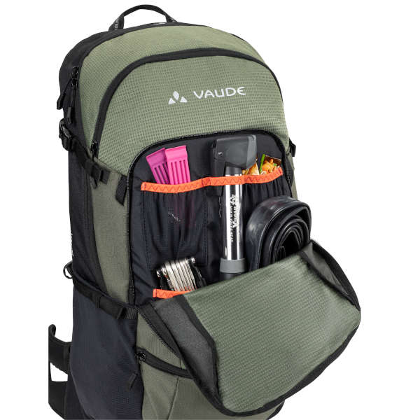 Der umfangreich ausgestattete Rucksack bietet abfahrtsbegeisterten Mountainbikern einen idealen Begleiter. Zur guten Belüftung bei schweißtreibenden Anstiegen wird das Rückensystem auf Spannung gebracht. Für die Abfahrt lässt sich das System zum Körperkontaktrücken wandeln. Durch die Shifting Back Length kann der Schultergurtansatz stufenlos perfekt an die Rückenlänge angepasst werden. Für optimale Bewegungsfreiheit und perfekten Sitz sorgen der Hüftgurt und der Brustgurt. Zur Ausstattung gehören ein großes Hauptfach, ein Wertsachenfach mit innenliegender Reißverschlusstasche, ein Werkzeugfach an der Rucksackfront, elastische Seitentaschen, ein separates Trinkblasenfach, Kompressionsriemen im Seitenbereich, ein Loop auf dem Träger für die Sonnenbrille und eine Regenhülle.