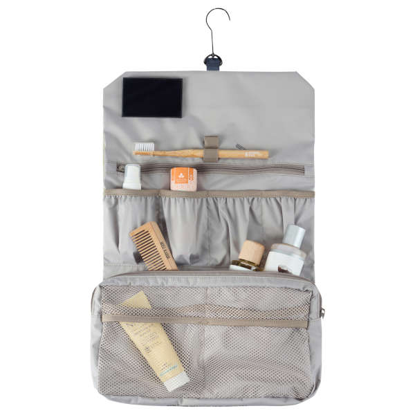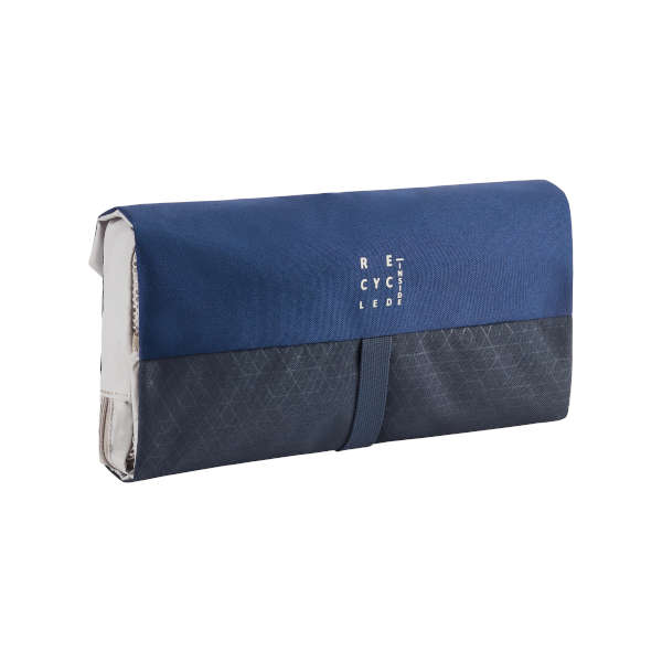 Der platzsparende Kulturbeutel mit Wickelverschluss ist ein unverzichtbarer Reisebegleiter für viele Jahre. Duschgel, Körperöl und andere Flüssigkeiten bleiben auslaufsicher verwahrt, da sie auf Reisen nicht um- oder herausfallen können. Aufgehängt bietet er eine schnelle, aufgeräumte Übersicht über alle Hygieneaccessoires. Zur Ausstattung gehören zudem ein kleiner Spiegel und ein Zahnbürstenhalter. Das recycelte Beutelmaterial ist wasserabweisend, widerstandsfähig und langlebig.